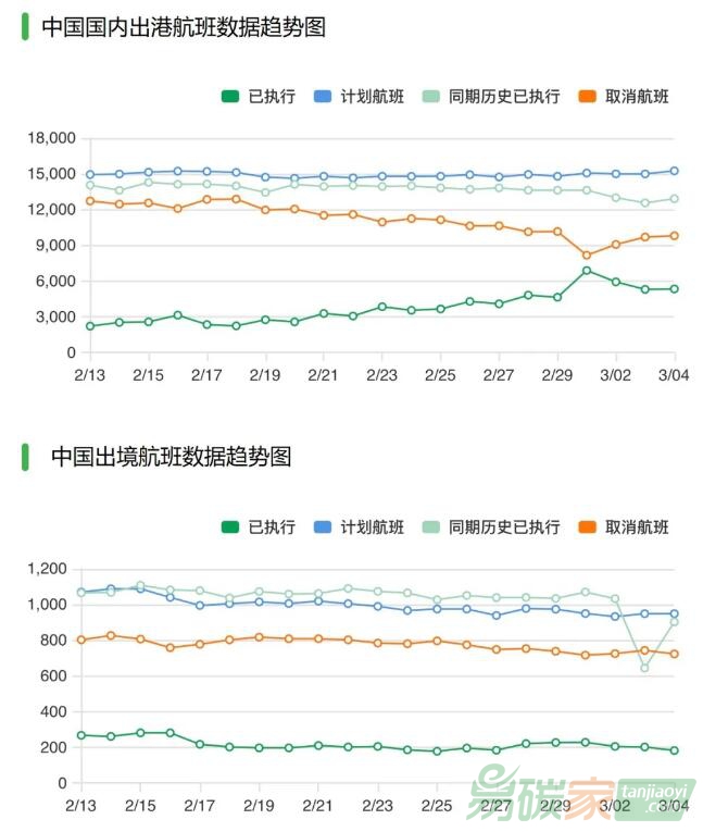 根據(jù)航旅縱橫的實時數(shù)據(jù),2月13日至3月4日,中國境內(nèi)國際航班進出港班次同比下降60%-80%。