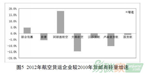 (2)發(fā)展速度。作為宏觀經(jīng)濟(jì)的晴雨表,航空業(yè)極易受到外部經(jīng)濟(jì)環(huán)境的影響。2008 年金融危機(jī)后,隨著經(jīng)濟(jì)復(fù)蘇,2010 年航空貨運(yùn)業(yè)均有了大幅回升。然而,之后受到歐洲債務(wù)危機(jī)和國(guó)際經(jīng)濟(jì)萎縮影響,全球航空貨運(yùn)業(yè)暫時(shí)出現(xiàn)了負(fù)增長(zhǎng)。如圖5 所示,2012 年主要航空貨運(yùn)企業(yè)的貨郵周轉(zhuǎn)量和2010 年相比,均出現(xiàn)不同程度的下跌。