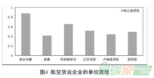 (1)單位噸公里排放[7 ~ 13]。由于航空貨運(yùn)企業(yè)的單位噸公里排放都較低,如圖4 所示,除了UPS 這種綜合物流服務(wù)商以及阿聯(lián)酋這種客貨兼營(yíng)航空公司單位排放相對(duì)較高,其他貨運(yùn)航空的單位排放均在0.5 左右,而歐盟公布的2012 年的基準(zhǔn)值為0.6797 kgCO2/RTK[14],可以看出,主要航空貨運(yùn)企業(yè)均低于此基準(zhǔn)值。因此,分配給航空公司配額時(shí),將會(huì)產(chǎn)生剩余。
