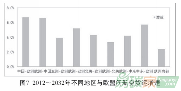 近年受到國際經(jīng)濟萎縮和歐洲債務(wù)危機影響,全球航空貨運暫時出現(xiàn)負增長,但預(yù)測隨著未來經(jīng)濟形勢的好轉(zhuǎn),航空貨運業(yè)將保持增長態(tài)勢,本文選取了不同地區(qū)與歐盟間航空貨運增速的相關(guān)預(yù)測,如圖7 所示,不同地區(qū)間發(fā)展速度差異相當顯著。