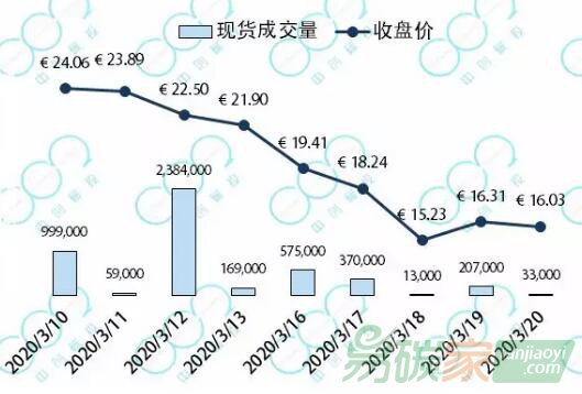 2020年3月16日至2020年3月20日,歐盟碳價(jià)大幅跳水,下跌27%至16.03歐元每噸。在3月18日一天時(shí)間內(nèi),碳價(jià)就下跌了17%。在近兩周中,歐盟碳價(jià)已下跌了1/3。