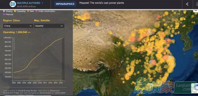 英國(guó)CarbonBrief網(wǎng)站發(fā)表更新版的中國(guó)煤電地圖。截至2019年底,中國(guó)在運(yùn)煤電裝機(jī)容量為1,004,948兆瓦(10.05億千瓦),是2000年(199,376兆瓦)的5倍,平均每年增長(zhǎng)8.9%。