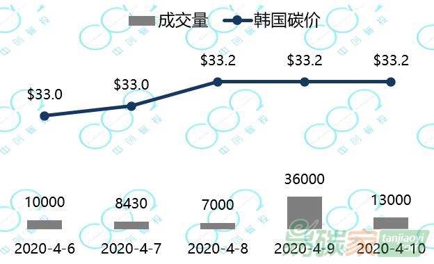 2020年4月6日至2020年4月10日,韓國(guó)碳價(jià)自33.0美元小幅上漲至33.2美元每噸。