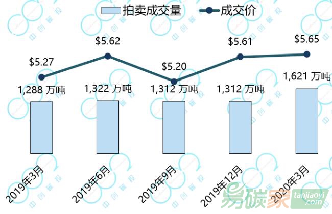 2020年3月,RGGI碳市場(chǎng)舉行了本年第一次拍賣(mài),拍賣(mài)配額現(xiàn)貨1621萬(wàn)噸全部成交,成交價(jià)5.65美元每噸,較去年同期上漲7%。