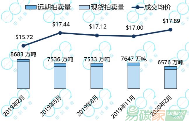 2020年2月,加州-魁北克碳市場(chǎng)舉行了本年第一次拍賣(mài),拍賣(mài)配額現(xiàn)貨5709萬(wàn)噸全部成交,成交價(jià)17.87美元每噸;拍賣(mài)2023年生效的配額867萬(wàn)噸全部成交,成交價(jià)18.00美元每噸。成交均價(jià)較去年同期上漲14%。