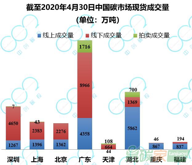 截至2020年4月30日,全國CCER累計成交2.2億噸。其中上海CCER累計成交量持續(xù)領(lǐng)跑,達9685萬噸,占比44%;廣東CCER累計成交4613萬噸,排名第二,占比21%;北京、深圳和四川CCER累計成交量在1000-3000萬噸之間,分別占比10%左右;湖北、福建和天津市場交易量相對較小,在200-1000萬噸之間,占比均不到5%;重慶市場截至目前無成交。