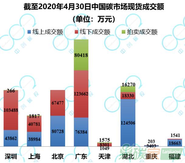 截至2020年4月30日,8個區(qū)域碳市場現(xiàn)貨累計成交3.91億噸,總成交額85.17億元。其中,廣東、湖北累計成交量與成交額最高,位于第一梯隊;深圳、北京、上海成交量與成交額均位于第二梯隊;天津、重慶、福建累計成交量與成交額相對較低,位于第三梯隊。