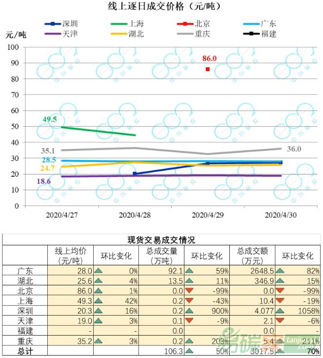 上海在27、28日發(fā)生成交,成交均價49.3元/噸,較前兩周有所提升。