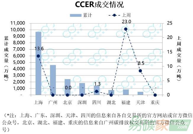 四川、福建市場均發(fā)生CCER交易,共計成交46.3萬噸,較前一周(24.3萬噸)有大幅上升。其中福建市場成交量最高,為23.0萬噸;上海市場次之,周成交13.6萬噸。