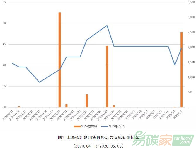 本報告期內(nèi)(2020年5月6日至2020年5月8日),上海碳配額(SHEA)現(xiàn)貨線上成交2,500噸,雖本周僅有三個工作日,但總成交量較上周稍有擴張,協(xié)議轉(zhuǎn)讓無成交。節(jié)后首周SHEA成交維持近期水平,整體活躍度一般,主要集中在周五當(dāng)日。價格方面,本周SHEA價格稍有走低,周四跌至40元/噸左右,后小幅回升,周五報收44.11元/噸,較節(jié)前最后一個工作日(4月30日)變化不大,略微下跌0.44元/噸。