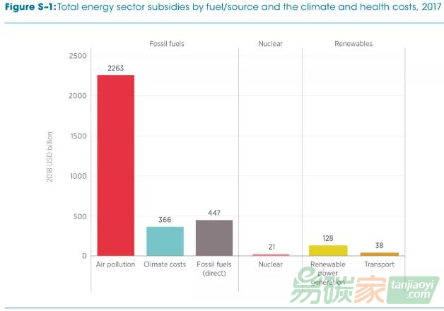 國際可再生能源署(IRENA)發(fā)布報(bào)告,估計(jì)2017年全球各國為能源部門提供的直接補(bǔ)貼至少為6340億美元。其中,4470億美元補(bǔ)貼給化石燃料(占比70%),1280億美元給可再生能源發(fā)電,380億美元給可再生能源生物燃料(可再生能源補(bǔ)貼占比26%)。各國對(duì)于核能的補(bǔ)貼缺乏數(shù)據(jù),但匡算為210億美元。如果考慮到化石燃料的外部性成本,全球?qū)τ谀茉床块T的補(bǔ)貼將大幅上升至3.1萬億美元,其中化石燃料的空氣污染成本高達(dá)2.3萬億美元、氣候變化成本3660億美元。