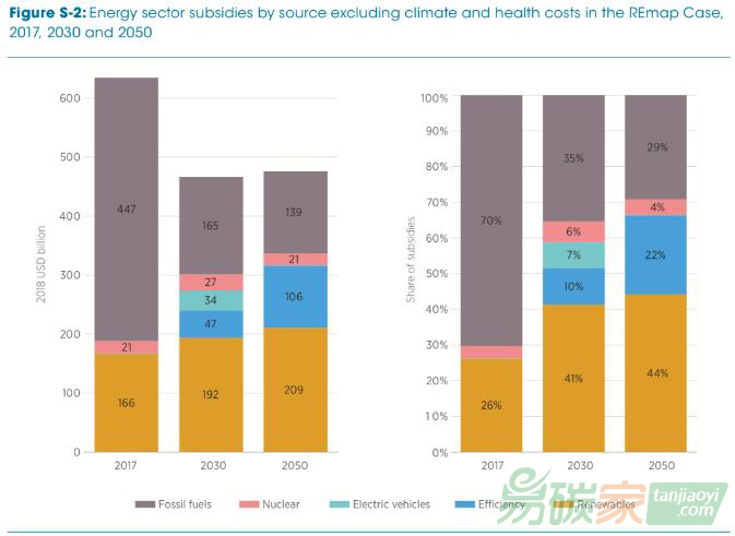 補(bǔ)貼下降的原因主要是各國對(duì)化石燃料直接補(bǔ)貼大幅度減少,將從2017年的4470億美元下降到2030年的1650億美元,2050年下降到的1390億美元。預(yù)計(jì)到2050年90%以上的化石燃料補(bǔ)貼僅用于支持工業(yè)應(yīng)用中的二氧化碳捕獲和儲(chǔ)存。隨著可再生能源發(fā)電的競爭日益激烈,特別是對(duì)太陽能光伏發(fā)電的早期高成本補(bǔ)貼到期,2030年可再生能源發(fā)電補(bǔ)貼降至530億美元,到2050年基本取消,屆時(shí)對(duì)可再生能源的補(bǔ)貼主要是可再生能源在其他領(lǐng)域的應(yīng)用。