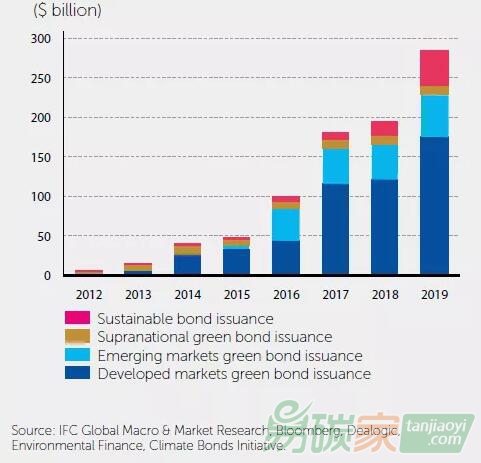 報告指出,2019年全球綠色債券市場表現(xiàn)超出預(yù)期,發(fā)行額創(chuàng)下2400億美元的紀(jì)錄。新興的可持續(xù)發(fā)展債券市場規(guī)模翻了一番,2019年發(fā)行額超過400億美元。新興市場綠色債券發(fā)行量較2018年增長21%達(dá)到520億美元,未償還綠債總額達(dá)到1680億美元。發(fā)達(dá)市場和新興市場的綠債發(fā)行量略高于去年全球債券發(fā)行總量的3%。