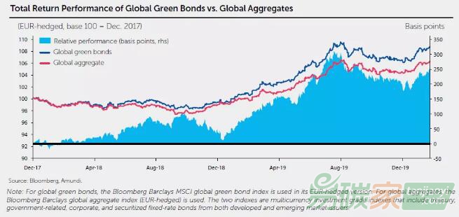 從指數(shù)方面來衡量,2019年也表現(xiàn)不俗。2019年全球綠色債券指數(shù)再次跑贏全球綜合債券基準(zhǔn)。自2017年底至2020年3月初,累積表現(xiàn)指數(shù)已超過200個基點(diǎn)?,F(xiàn)有數(shù)據(jù)顯示,全球范圍內(nèi)綠色債券在二級市場的交易價差比類似的傳統(tǒng)債券更低,新興市場的綠色債券一般不會溢價交易。