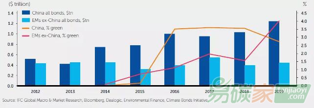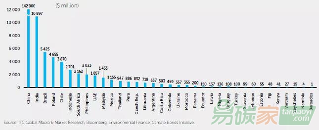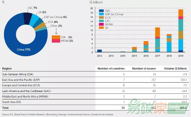 東亞和太平洋地區(qū)仍然是新興市場綠色債券發(fā)行的領(lǐng)頭羊(占總發(fā)行量的81%),中國去年的340多億美元仍然占了地區(qū)總量的大部分比例。