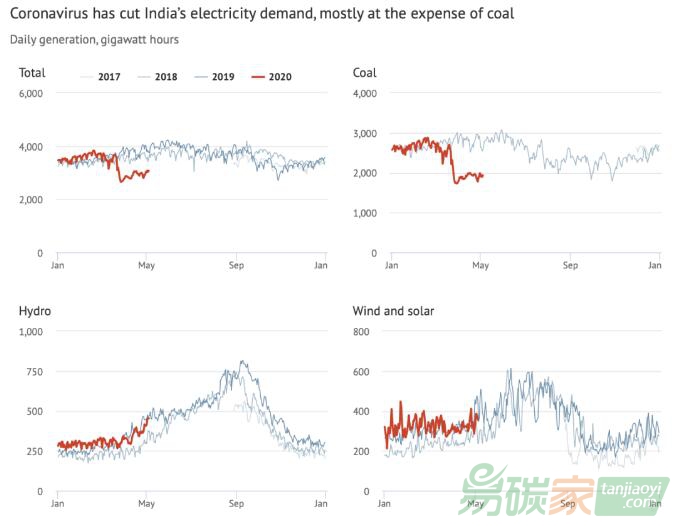 印度二氧化碳排放量的下降反映了自2019年初以來已經(jīng)影響印度經(jīng)濟的不利因素,以及可再生能源發(fā)電量的增加。此外,由于采取抗擊疫情的措施,3月份的二氧化碳排放降幅加大。