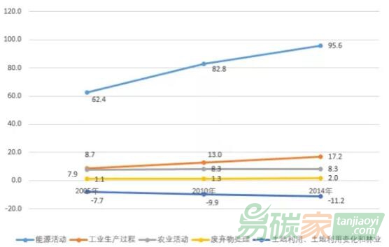 圖2 2005-2014年中國各領(lǐng)域溫室氣體排放和吸收(億噸CO2eq)