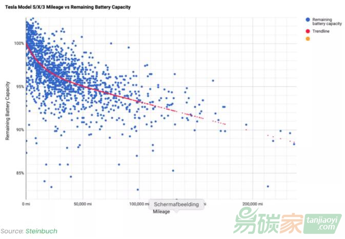在美國(guó),600輛特斯拉S型車總里程超過(guò)3700萬(wàn)公里,七年后電池的平均容量仍然在93%左右。而荷蘭特斯拉車主提供的數(shù)據(jù)顯示,汽車平均行駛超過(guò)28萬(wàn)公里,特斯拉電池的損耗不到其容量的10%。根據(jù)這些數(shù)據(jù)評(píng)估,大約行駛80000公里后,電池會(huì)損失5%的容量,但之后性能下降會(huì)變得更加線性;行駛近32萬(wàn)公里后電池容量會(huì)損失超過(guò)10%。