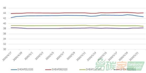 本報(bào)告期內(nèi)(2020年5月18日至2020年5月22日),上海碳配額遠(yuǎn)期中央對(duì)手清算業(yè)務(wù)保持平穩(wěn)運(yùn)行。遠(yuǎn)期市場(chǎng)價(jià)格整體小幅上揚(yáng),近端與遠(yuǎn)端協(xié)議仍維持一定價(jià)差。其中,2020年5月協(xié)議期末結(jié)算價(jià)43.22元/噸,較上周五環(huán)比上漲0.04元/噸,2020年8月協(xié)議期末結(jié)算價(jià)44.16元/噸,較上周五環(huán)比上漲0.02元/噸。