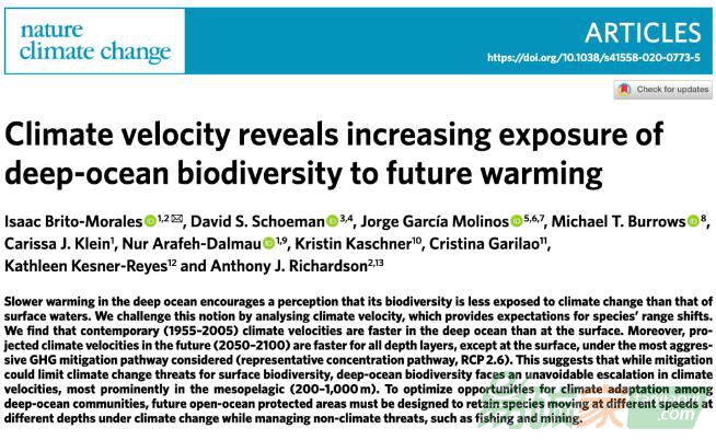 氣候速度基本上是一個(gè)特定物種在世界某地升溫時(shí)需要改變的速度和方向。由于深海變暖速度緩慢,人們以為生物多樣性不容易容易受到氣候變化的影響。但是,研究發(fā)現(xiàn),現(xiàn)代(1955-2005)的氣候速度在深海比在地表更快,最突出的是在中流域(200-1000?m)。為了優(yōu)化深海社區(qū)適應(yīng)氣候的機(jī)會,未來的公海保護(hù)區(qū)必須考慮氣候變化下以不同速度在不同深度移動(dòng)的物種。
