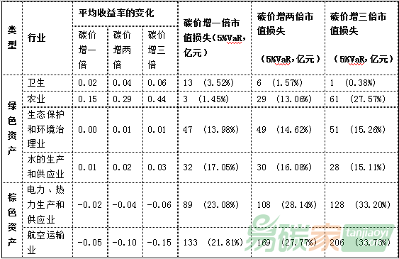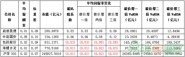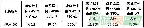 水泥)碳風(fēng)險系數(shù)趨向于為負,表明兩高一剩行業(yè)的碳風(fēng)險敞口明顯高于環(huán)保行業(yè)。而滬深300(281家上市公司)投資組合的碳風(fēng)險系數(shù)值為-0.0088,所以碳價升高會對股票回報率產(chǎn)生負面影響,滬深300存在碳價風(fēng)險敞口。而在VaR方面,在碳價上升1倍時,在5%極端風(fēng)險產(chǎn)生時,投資組合(滬深300)因為碳風(fēng)險而發(fā)生的市值損失高達2.6萬億元,約占其總市值(25萬億)的10%,亦即因為碳價上漲一倍,滬深300指數(shù)有5%的機率產(chǎn)生2.6萬億元市值損失。