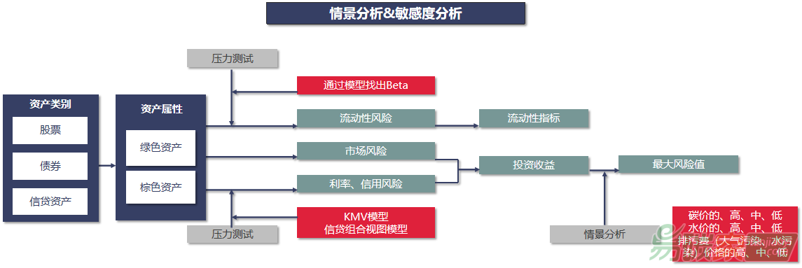 中央財經(jīng)大學(xué)綠色金融國際研究院(以下簡稱“中財綠金院”)創(chuàng)新開發(fā)了以風(fēng)險值模型為核心的環(huán)境壓力測試方法學(xué)。該方法學(xué)創(chuàng)新將環(huán)境因子(如碳風(fēng)險、環(huán)保處罰風(fēng)險、水風(fēng)險等)納入資產(chǎn)定價模型和風(fēng)險值(VaR)模型,結(jié)合敏感性分析評估投資組合是否受環(huán)境與氣候因素的影響,同時納入情景分析模擬未來可能發(fā)生的環(huán)境和氣候事件等環(huán)境壓力情景下,投資組合的價值變動,定量測算環(huán)境和氣候風(fēng)險對銀行的信貸資產(chǎn)組合的投資收益率的影響,最后計算在極端環(huán)境和氣候風(fēng)險下給投資組合可能帶來的最大風(fēng)險值(VaR)。 該方法學(xué)適用于股票、債券、信貸等多種資產(chǎn)的投資組合環(huán)境風(fēng)險評估。