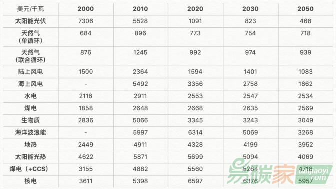 根據(jù)Energy Intelligence雜志匯總的數(shù)據(jù),2000-2020年各類發(fā)電技術裝機的投資成本(美元/千瓦)以及2030-2050年預測(以歐美裝機數(shù)據(jù)為基礎的均值,不計財務成本,2020年美元計)如下表所示: