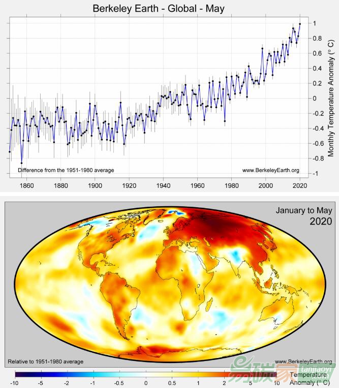 美國非營利組織Berkeley Earth對2020年5月全球氣溫狀況的檢測分析表明,2020年5月是自1850年有記錄以來最熱的5月。2020年5月全球平均氣溫比1951年至1980年平均氣溫高0.99(±0.08)℃,相當于比1850至1900年的平均氣溫高出1.36(±0.09)℃。1850至1900年的平均氣溫經(jīng)常被用作工業(yè)化前時期的基準,巴黎協(xié)定的目標是力爭溫升不超過1.5℃。