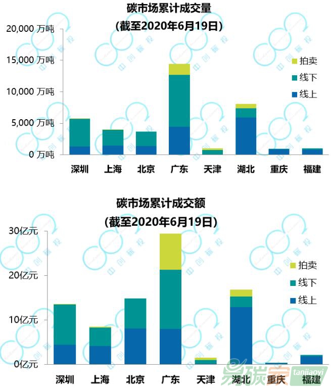 截至2020年6月19日,8個(gè)區(qū)域碳市場(chǎng)現(xiàn)貨累計(jì)成交3.88億噸,總成交額87.34億元。其中,廣東、湖北累計(jì)成交量與成交額最高,位于第一梯隊(duì);深圳、北京、上海成交量與成交額均位于第二梯隊(duì);天津、重慶、福建累計(jì)成交量與成交額位于第三梯隊(duì)。