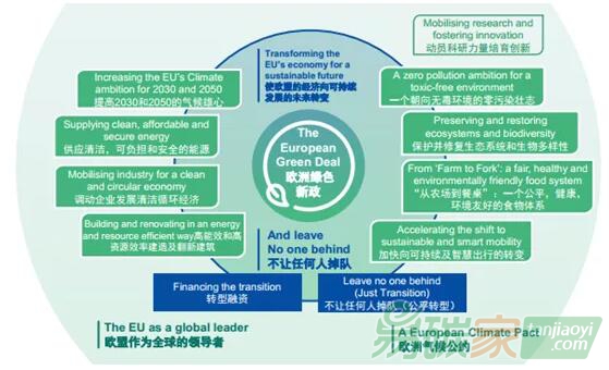 作為歐盟新的增長戰(zhàn)略,新政旨在“將歐盟轉(zhuǎn)變?yōu)橐粋€公平、繁榮的社會和富有競爭力的資源節(jié)約型現(xiàn)代化經(jīng)濟體,到2050年歐盟溫室氣體達到凈零排放并且實現(xiàn)經(jīng)濟增長與資源消耗脫鉤”,讓歐洲走上可持續(xù)和包容性發(fā)展道路。新政草案不僅提出了歐盟2050年