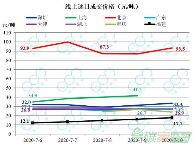 北京碳價(jià)與上周基本持平,線上成交均價(jià)達(dá)88.7元/噸,本周成交3.5萬(wàn)噸。7月7日線上成交價(jià)格達(dá)100元/噸。