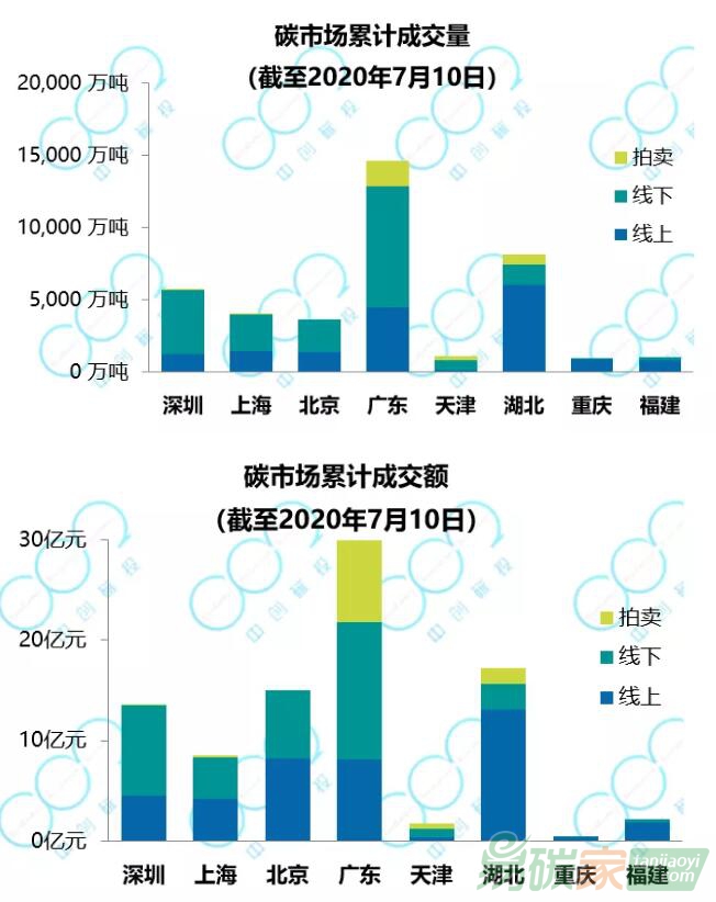 截至2020年7月10日,8個(gè)區(qū)域碳市場(chǎng)現(xiàn)貨累計(jì)成交3.92億噸,總成交額88.42億元。其中,廣東、湖北累計(jì)成交量與成交額最高,位于第一梯隊(duì);深圳、北京、上海成交量與成交額均位于第二梯隊(duì);天津、重慶、福建累計(jì)成交量與成交額位于第三梯隊(duì)。