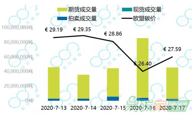 2020年7月13日至7月17日,歐盟碳價(jià)本周有所回落,周四大量的拋盤將碳價(jià)打壓了10%。截至周五報(bào)收于27.59歐元每噸。