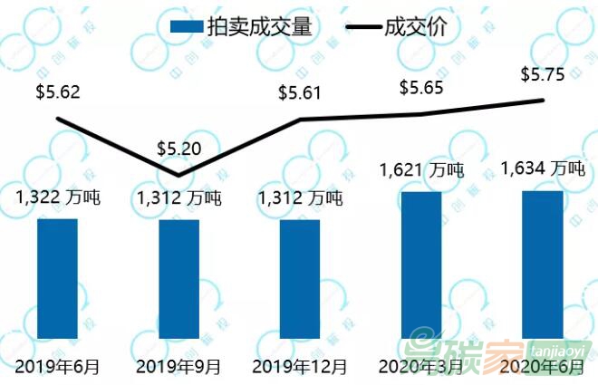 RGGI碳市場(chǎng)的初始配額發(fā)放以拍賣為主,每個(gè)季度舉行一次拍賣。2020年拍賣基價(jià)設(shè)定于2.32美元。2020年3月,RGGI碳市場(chǎng)舉行了本年第一次拍賣,拍賣配額1621萬噸全部成交,成交價(jià)5.65美元每噸。2020年6月,RGGI碳市場(chǎng)舉行了本年第二次拍賣,拍賣配額1634萬噸全部成交,成交價(jià)5.75美元每噸,較去年同期上漲2%。