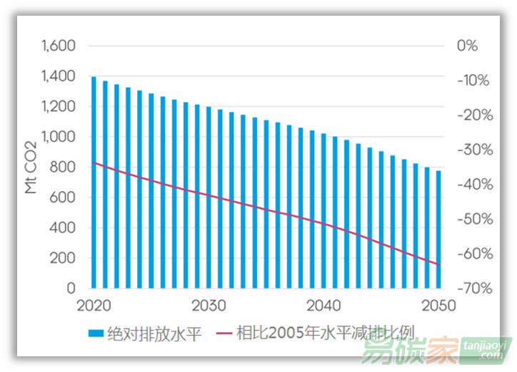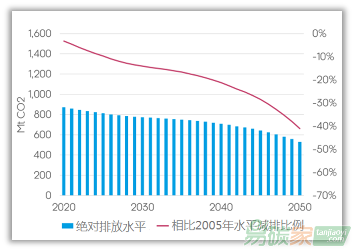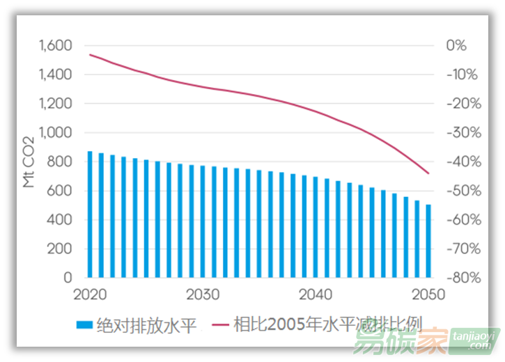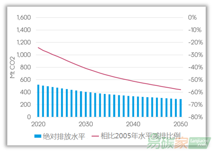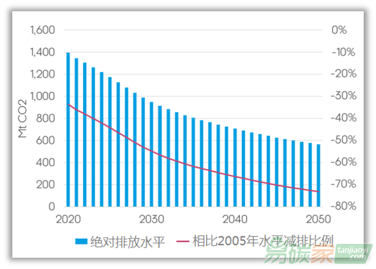 到2030年公路交通排放預(yù)計(jì)將比2005年水平低14%左右;而建筑物(主要為采暖)排放將比2005年水平低34%。到2050年公路交通和建筑排放預(yù)計(jì)分別低于2005年水平的37%和41%,絕對(duì)CO2排放分別略高于5.5億噸和4億噸。