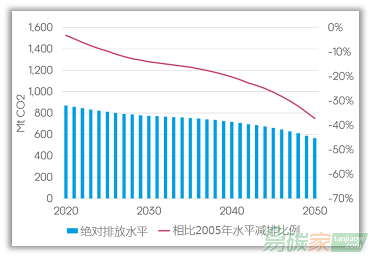 ETS納管行業(yè)(包括發(fā)電和能源密集型制造業(yè))減排速度將加快。然而,由于最終能源用戶(尤其是運(yùn)輸業(yè))的排放量持續(xù)下降,因此從長期來看,電力需求增加導(dǎo)致額外減排量在2040年左右趨于平穩(wěn)。