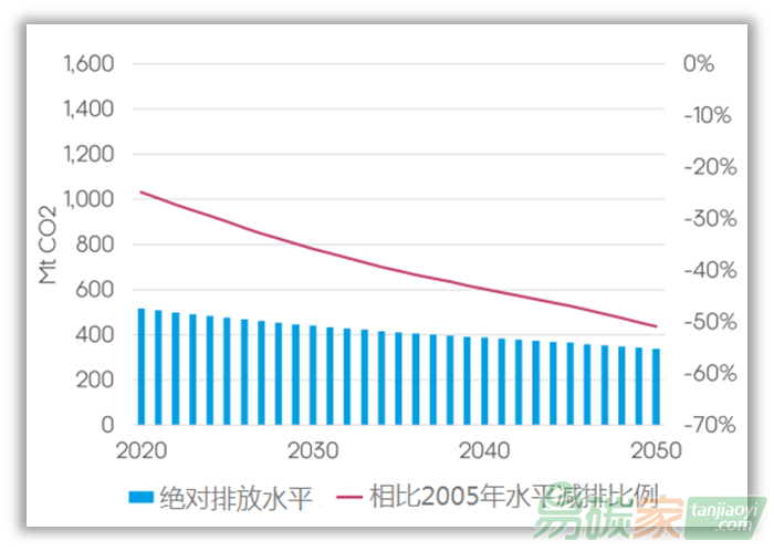 根據(jù)歐盟減排政策及PRIMES 2016減排目標(biāo),歐盟ETS當(dāng)前納管行業(yè)的減排目標(biāo)為到2030年比2005年水平減少43%,到2050年比2005年水平減少63%,這相當(dāng)于到2050年,歐盟成員國和英國的二氧化碳排放總量應(yīng)略低于8億噸。