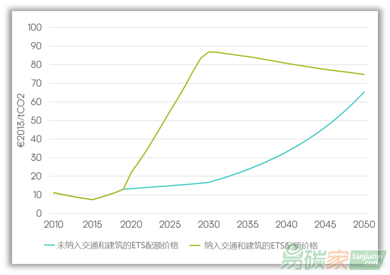 將公路交通和建筑物納入ETS機(jī)制后,若要實(shí)現(xiàn)ETS目標(biāo)所需的減排量(即2030年排放量比2005年水平低43%,2050年排放量比2050年低63%),則需要比當(dāng)前ETS更高的配額價(jià)格,這勢(shì)必對(duì)現(xiàn)有ETS納管行業(yè)的競(jìng)爭(zhēng)力產(chǎn)生影響。