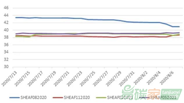 本報告期內(nèi)(2020年8月3日至2020年8月7日),上海碳配額遠期(SHEAF)中央對手清算業(yè)務(wù)保持平穩(wěn)運行,遠期市場最近端的2020年8月協(xié)議價格與遠端協(xié)議價差持續(xù)縮小。其中,2020年8月協(xié)議期末結(jié)算價40.95元/噸,較上周五環(huán)比下跌1.18元/噸,2020年11月協(xié)議期末結(jié)算價38.65元/噸,較上周五環(huán)比上漲0.45元/噸(如圖2)。