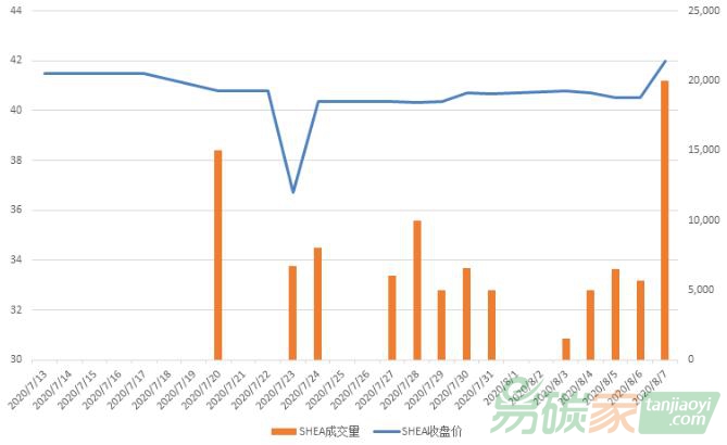 碳配額(SHEA)現(xiàn)貨線上成交38,710噸,繼續(xù)較上周有所擴張,協(xié)議轉(zhuǎn)讓無成交。本周SHEA現(xiàn)貨市場交投依舊較為活躍,每日均有交易達成,其中周五成交量最大,當(dāng)日成交達20,010噸。價格方面,本周SHEA價格前幾日波幅不大,維持40元/噸左右水平,周五略微上揚,報收42.00元/噸,創(chuàng)近一個多月以來的峰值,較上周五環(huán)比上漲1.32元/噸(如圖1)。