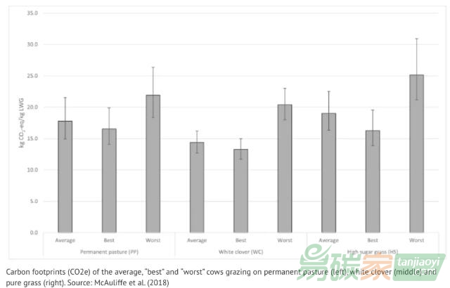 結(jié)果表明,飼喂白三葉草的牛的碳足跡最小,而來(lái)自常規(guī)農(nóng)場(chǎng)和純草農(nóng)場(chǎng)的牛碳足跡最大。這是因?yàn)榘兹~草系統(tǒng)不需要使用氮肥,避免了與施用氮肥相關(guān)的排放,而且也意味著氮肥生產(chǎn)的上游排放也得到了避免。