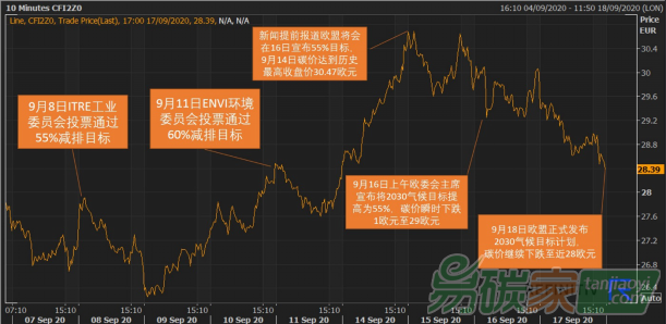 然而,’’ 買(mǎi)入謠言,賣(mài)出事實(shí)’’這一交易界的真理,當(dāng)16日上午,歐盟委員會(huì)主席馮德萊恩發(fā)表“盟情咨文”宣布要將歐盟的2030年減排目標(biāo)提高到55% ,碳價(jià)應(yīng)聲而跌,十分鐘內(nèi)下降幅度高達(dá)1歐元。當(dāng)天收盤(pán)之時(shí),價(jià)格快速回升至30歐元。然而這一反彈持續(xù)的時(shí)間并不久。17日歐盟委員會(huì)正式發(fā)布了2030氣候目標(biāo)計(jì)劃,碳價(jià)卻繼續(xù)下跌,最后收盤(pán)于28.39歐元。