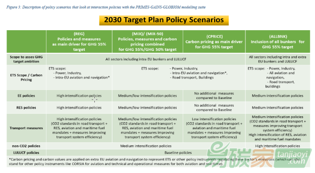 圖3 歐盟9月17日發(fā)布的2030氣候目標(biāo)計(jì)劃和影響評估報(bào)告中基于不同碳市場和能源政策的主要場景假設(shè)一覽圖