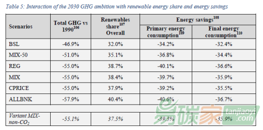 圖4歐盟2030氣候目標(biāo)計(jì)劃和影響評估報(bào)告中不同場景下55%減排目標(biāo)和可再生能源以及能效目標(biāo)的相互協(xié)同