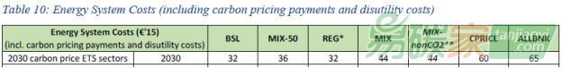 這一基于歐盟能源系統(tǒng)長期模型的評估報(bào)告中,也展示了對碳價的預(yù)測。這里的碳價格主要等同于不同階段的減排成本,和實(shí)際中