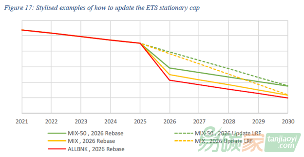 歐盟的評估報(bào)告中雖然提到了要修改碳市場配額總供給Cap和線性調(diào)整系數(shù)LRF,但是并沒有給出具體參數(shù),而是說將以后再公布。報(bào)告中提供了不同場景下歐盟碳市場Cap在2026年進(jìn)行修改的走勢示意圖,并提出了2026年調(diào)整Cap基準(zhǔn)這個場景。這一場景是指在2026年將Cap降低為2025年碳市場的實(shí)際排放,因此就不需要過高增加線性調(diào)整系數(shù)LRF。