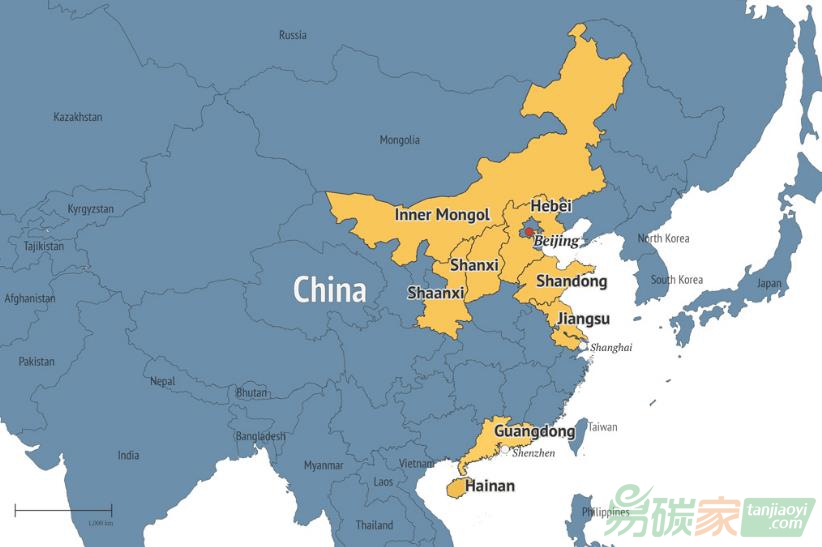 中國各省。制圖:碳簡報。來源:Esri。免責聲明:本地圖所采用的名稱及材料的呈現(xiàn)方式,并不代表著《碳簡報》就任何國家、領土、城市或地區(qū),或其當局的法律地位,或就其國境或邊界的劃定