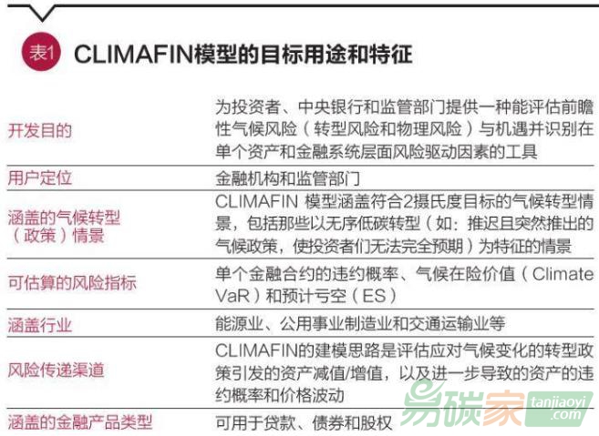 CLIMAFIN 模型框架是一套用于定量評(píng)估單個(gè)資產(chǎn)和投資組合未來氣候風(fēng)險(xiǎn)以及對這些風(fēng)險(xiǎn)定價(jià)的科學(xué)方法。具體而言,CLIMAFIN 模型可以在各種氣候情景中,前瞻性地估算以下金融風(fēng)險(xiǎn)指標(biāo):一是金融合約和債券的違約概率;二是金融機(jī)構(gòu)和監(jiān)管機(jī)構(gòu)關(guān)注的關(guān)鍵風(fēng)險(xiǎn)指標(biāo),包括氣候在險(xiǎn)值、氣候利差;三是基于金融網(wǎng)絡(luò)模型的系統(tǒng)性氣候壓力測試結(jié)果。表 1 總結(jié)了 CLIMAFIN 的目標(biāo)用途和一些關(guān)鍵特征。