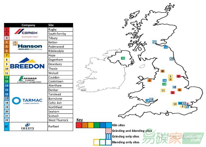 節(jié)能效益會為帶來每噸熟料0.41噸CO2負排放效果。預計路線圖將會促使英國有5家水泥和混凝土企業(yè)轉型,包括分布在全國23個的地區(qū)的水泥和混凝土項目 [8] (圖3)。