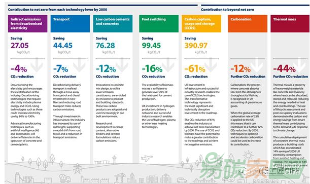 運輸網絡的脫碳、燃料轉換、使用更多的低碳水泥和混凝土、和在水泥制造中應用碳捕集、利用與封存(CCUS)技術。其中CCUS會帶來61%所需要的